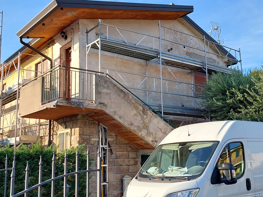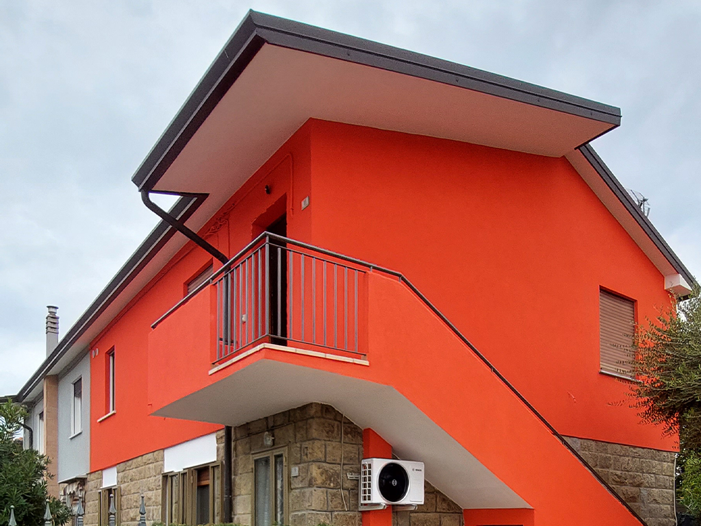 Esecuzione di lavaggio in alta pressione per rimozione di muffe e pitture sfaldanti, rasatura armata e successiva finitura con intonachini e pitture altamente traspiranti additivati antialga e antimuffa.